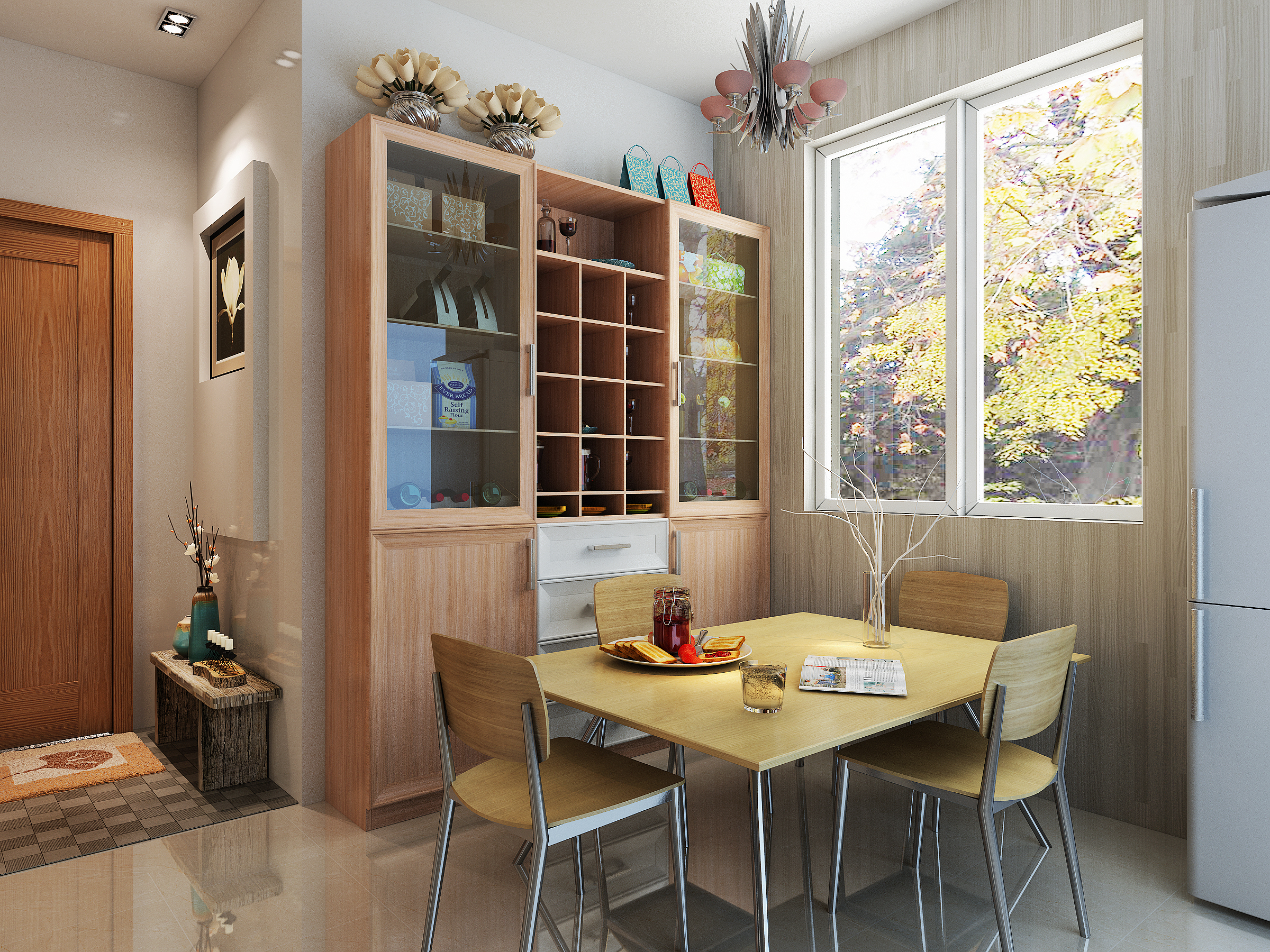 这款原木色彩配瓷砖作用图怎么样?天然橡木纹路在视觉上得到延伸,白色装点,让空间看起来洁净整齐,带有一些现代田园风格的清淡温馨。实木餐桌拼接餐酒柜,进步空间利用率。
