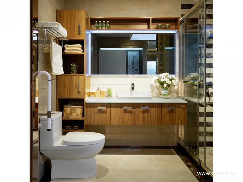 原木色彩配瓷砖尊享清新天然,让繁忙一天的身心快速地得到全身心舒展。原木纹路明晰可见,触感润滑,悬挂式澡堂柜防潮防水,封闭式规划更好的储藏澡堂洁具。淋浴房玻璃间隔,干湿别离,营建一个整齐洁净的洗漱环境。